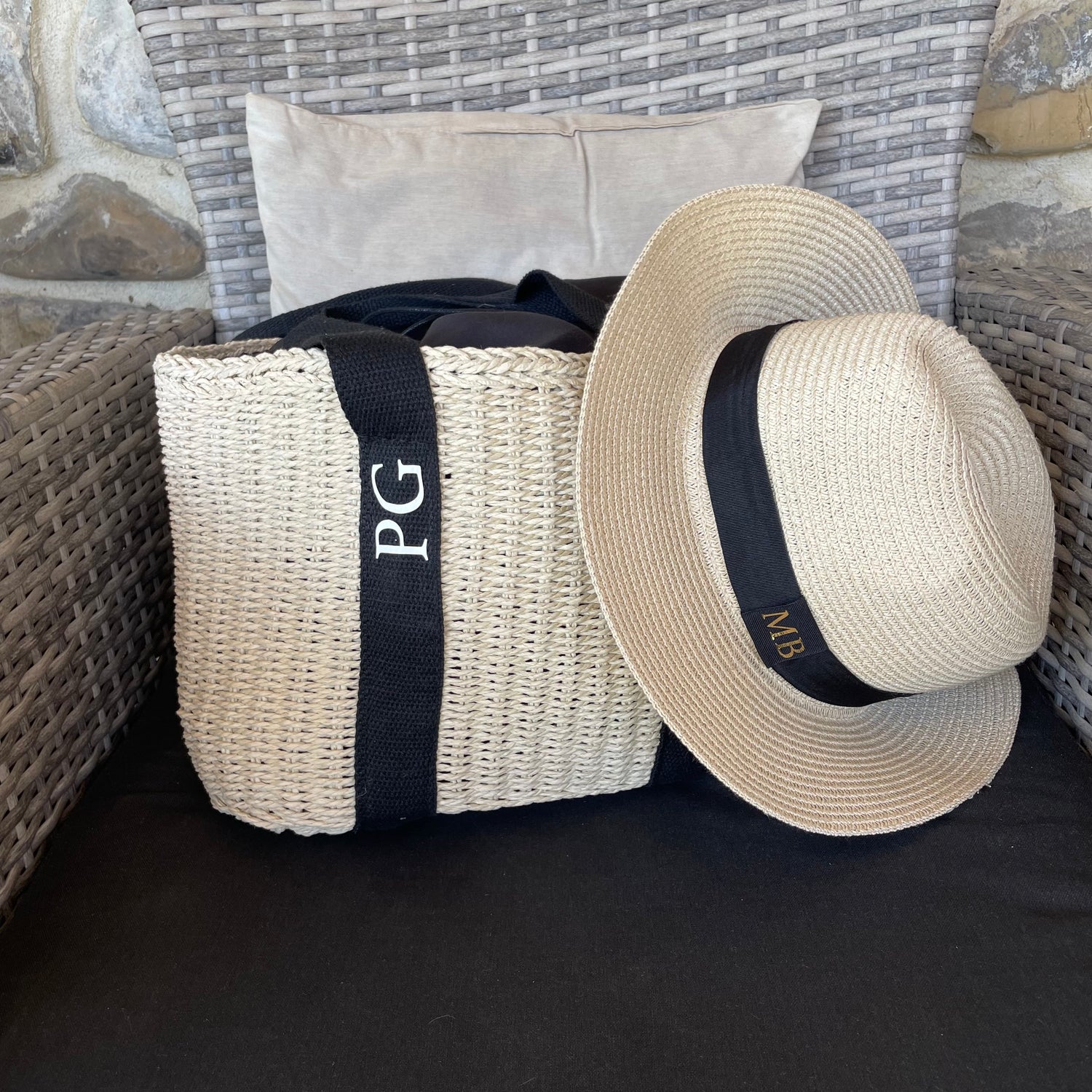 Personalised GRACE Straw Wicker Black Ribbon Drawstring Beach Bag