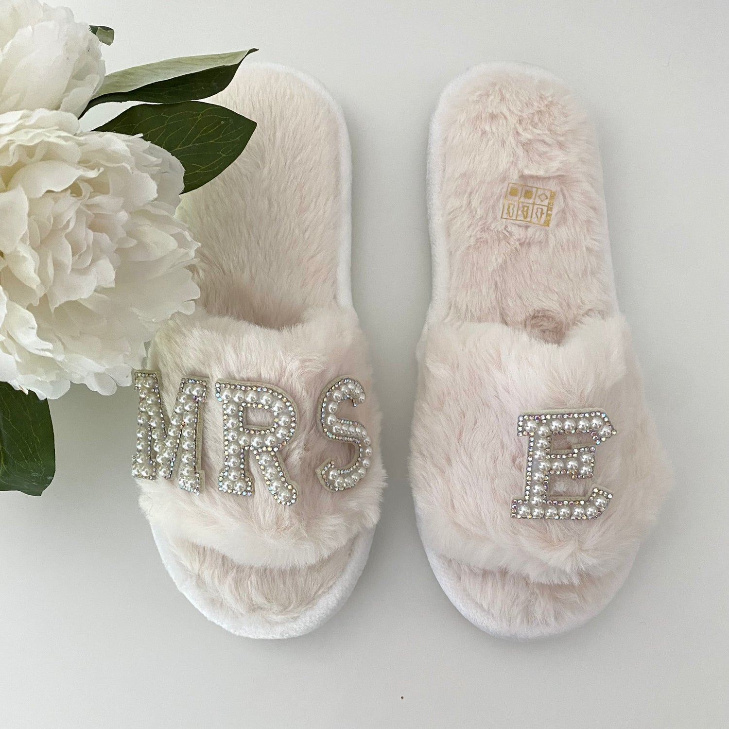 Pearl Patch Fluffy Embroidered Slider Slippers