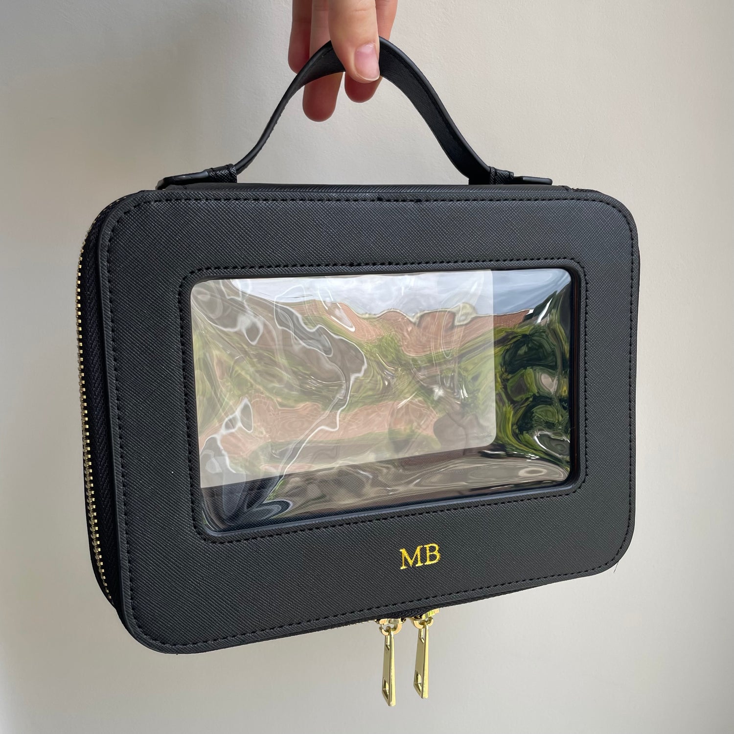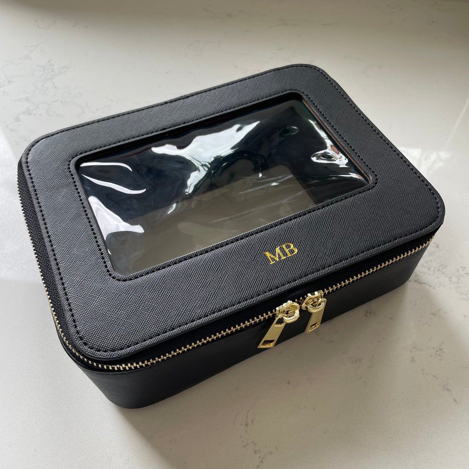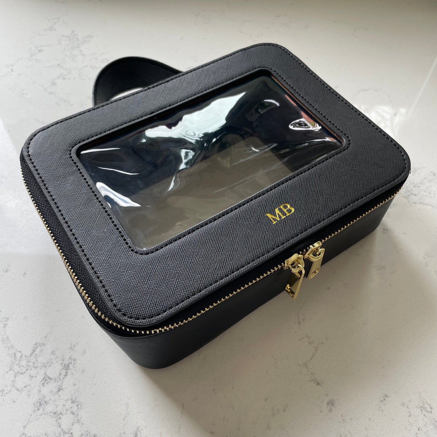 Personalised Black Fine Grain Saffiano Leather Clear Panel Makeup Carry Case
