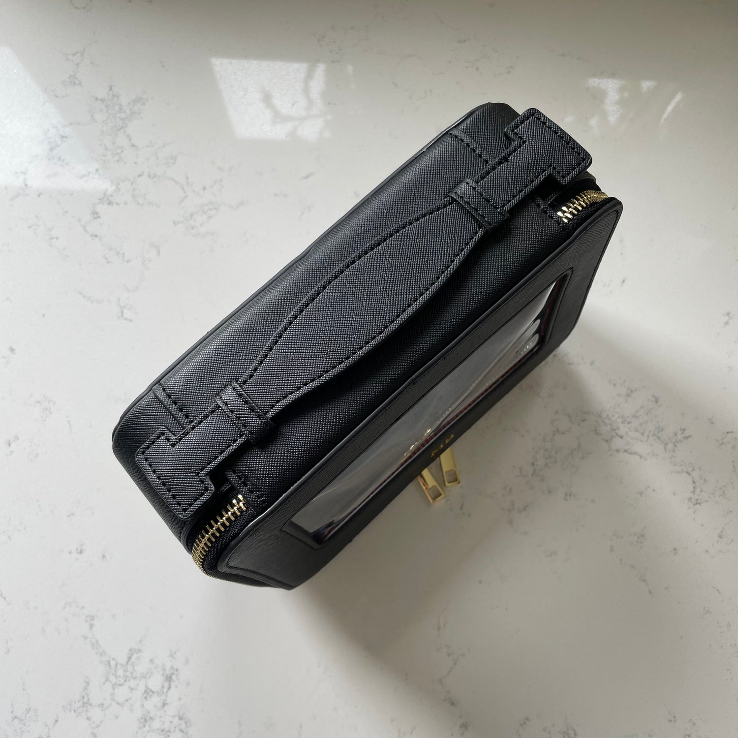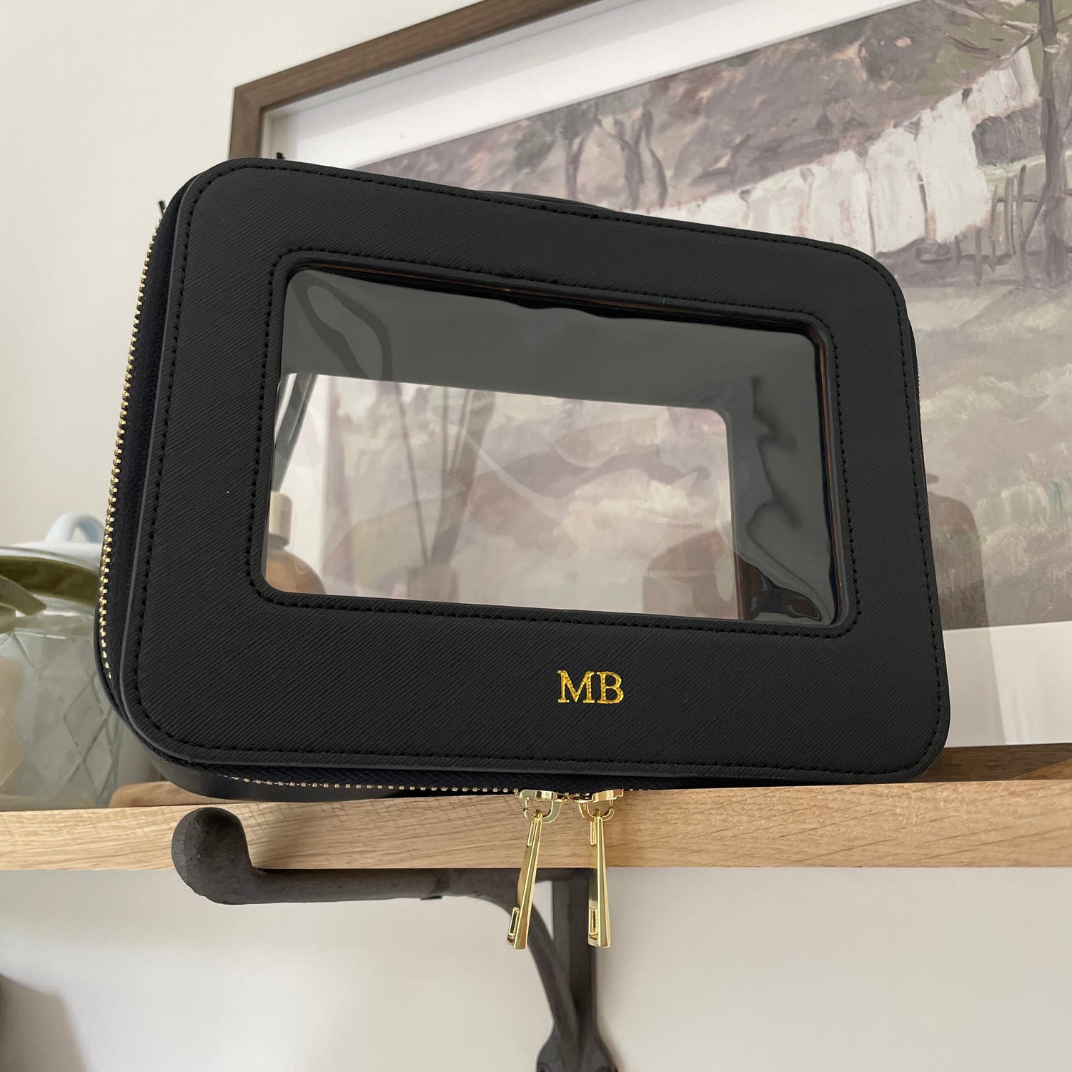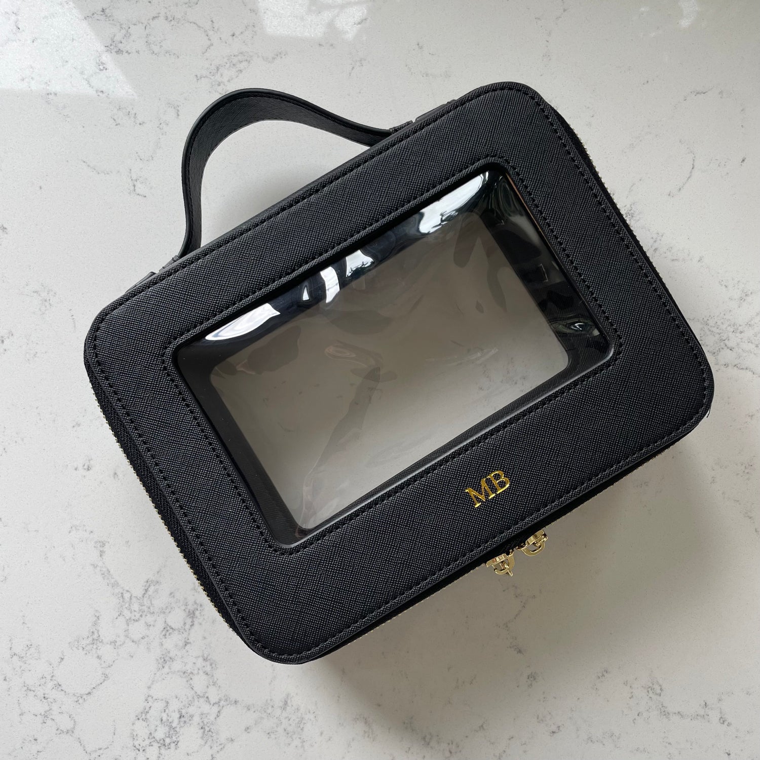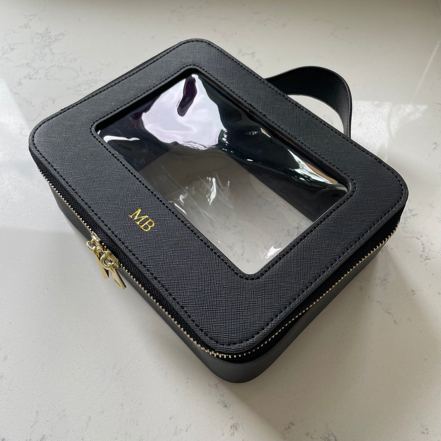 Personalised Black Fine Grain Saffiano Leather Clear Panel Makeup Carry Case