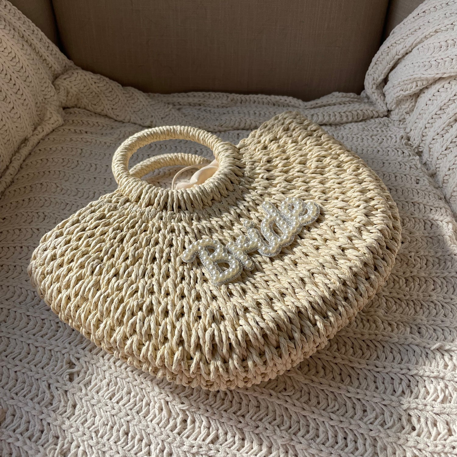 Large Bride Straw Handle Half Moon Semi Circle Basket Drawstring Bag