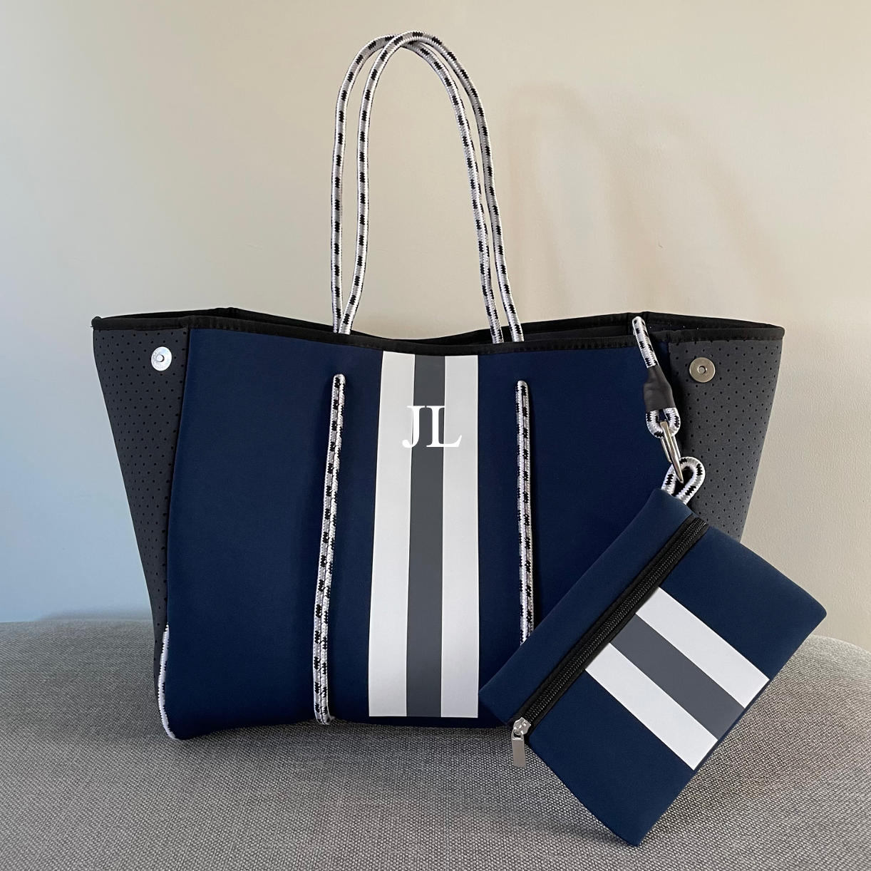 Personalised Navy Stripe Neoprene Tote Bag & Pouch