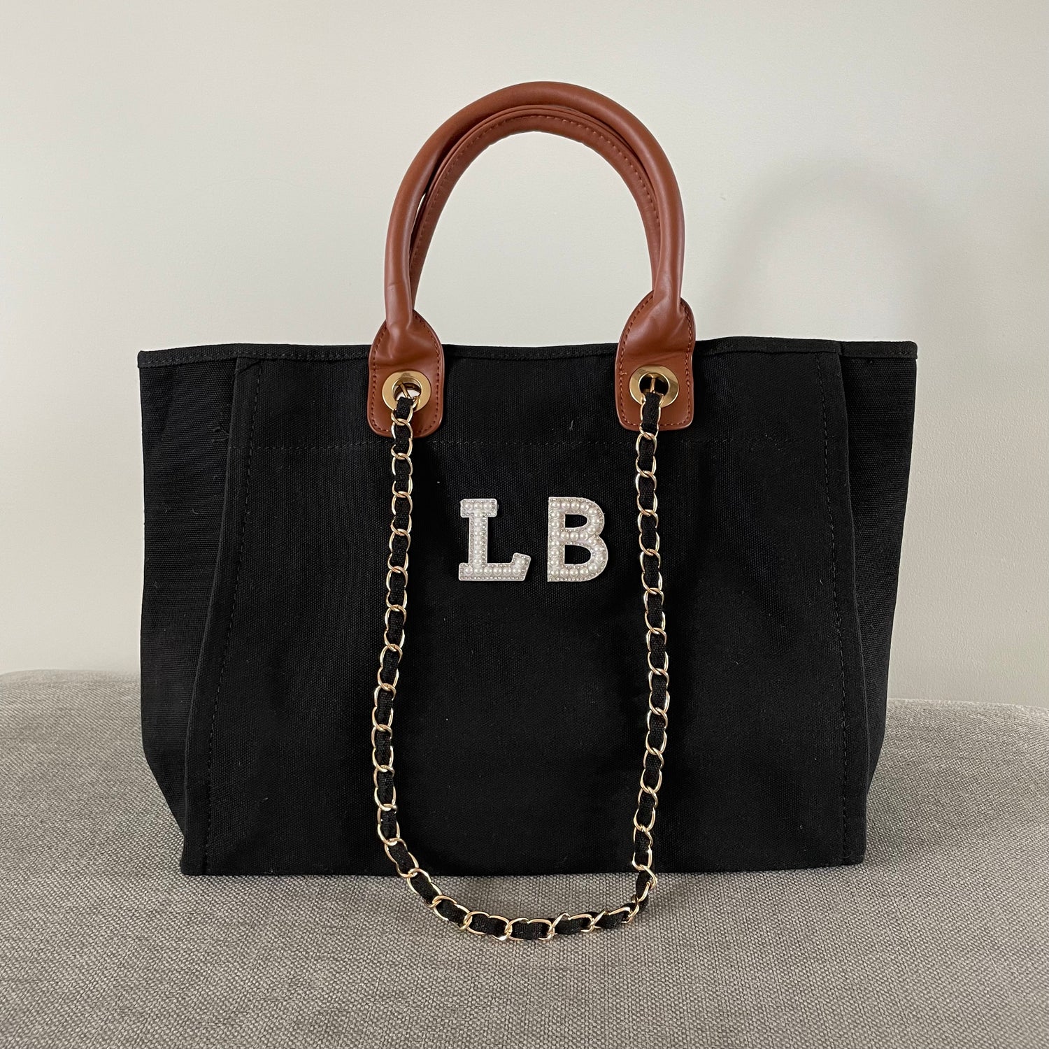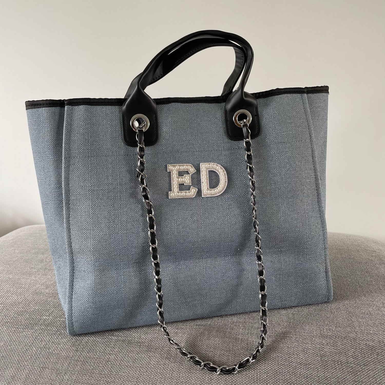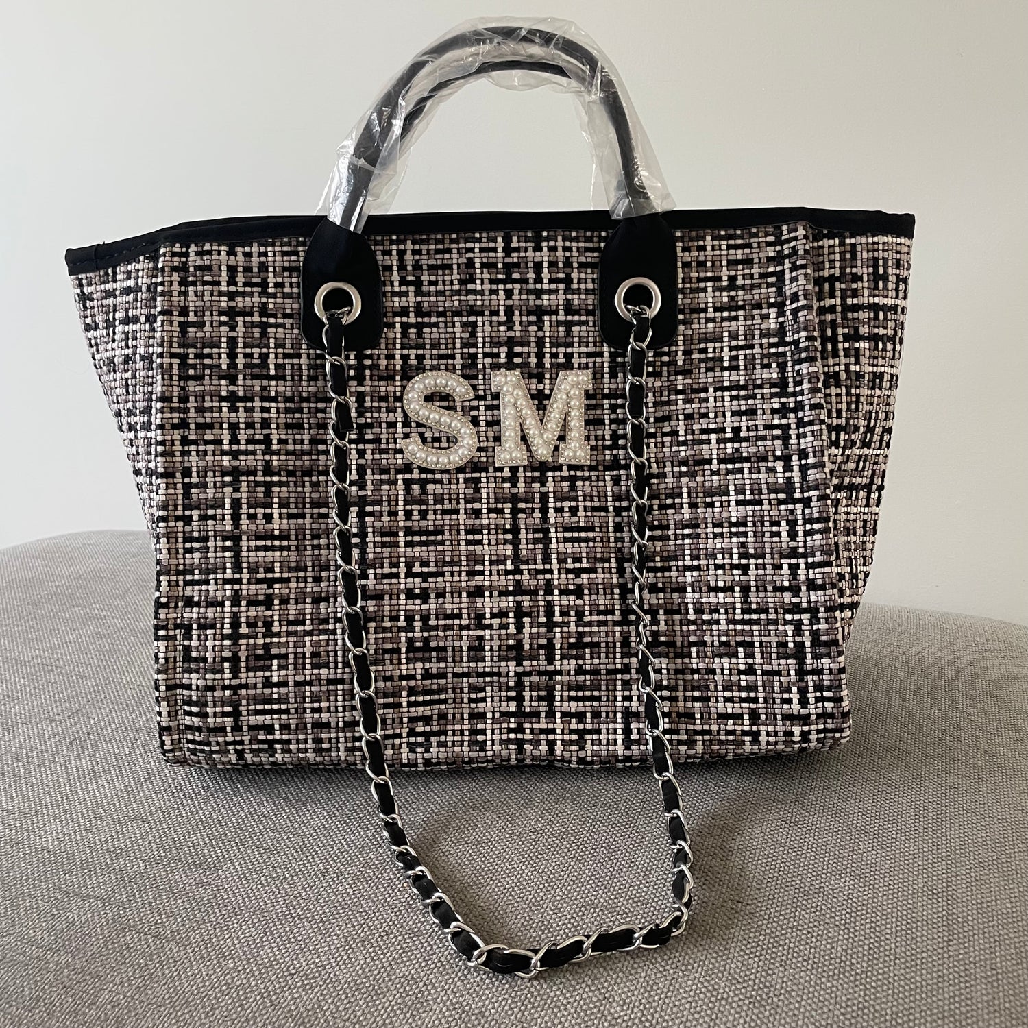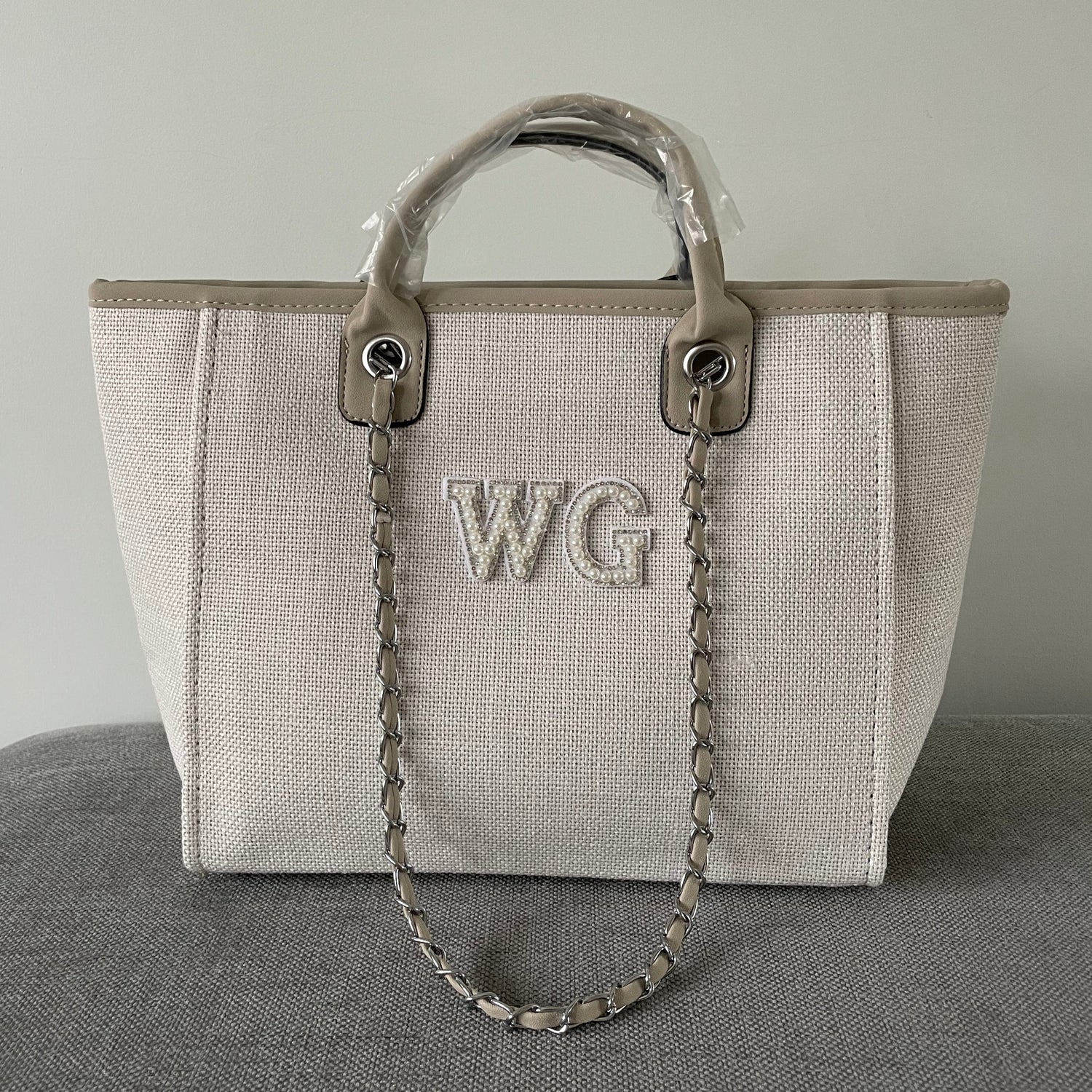 Personalised White Pearl Patch Chain Large Initial Tote Bags