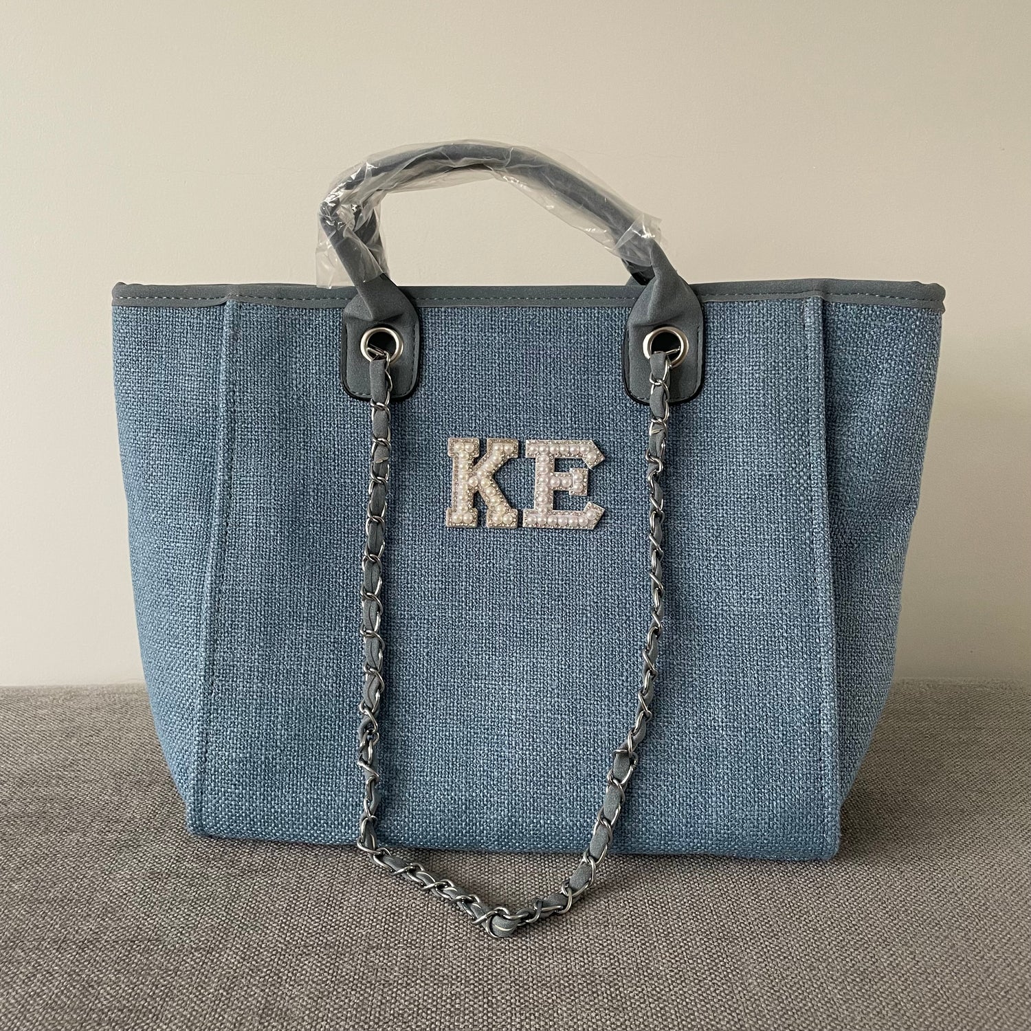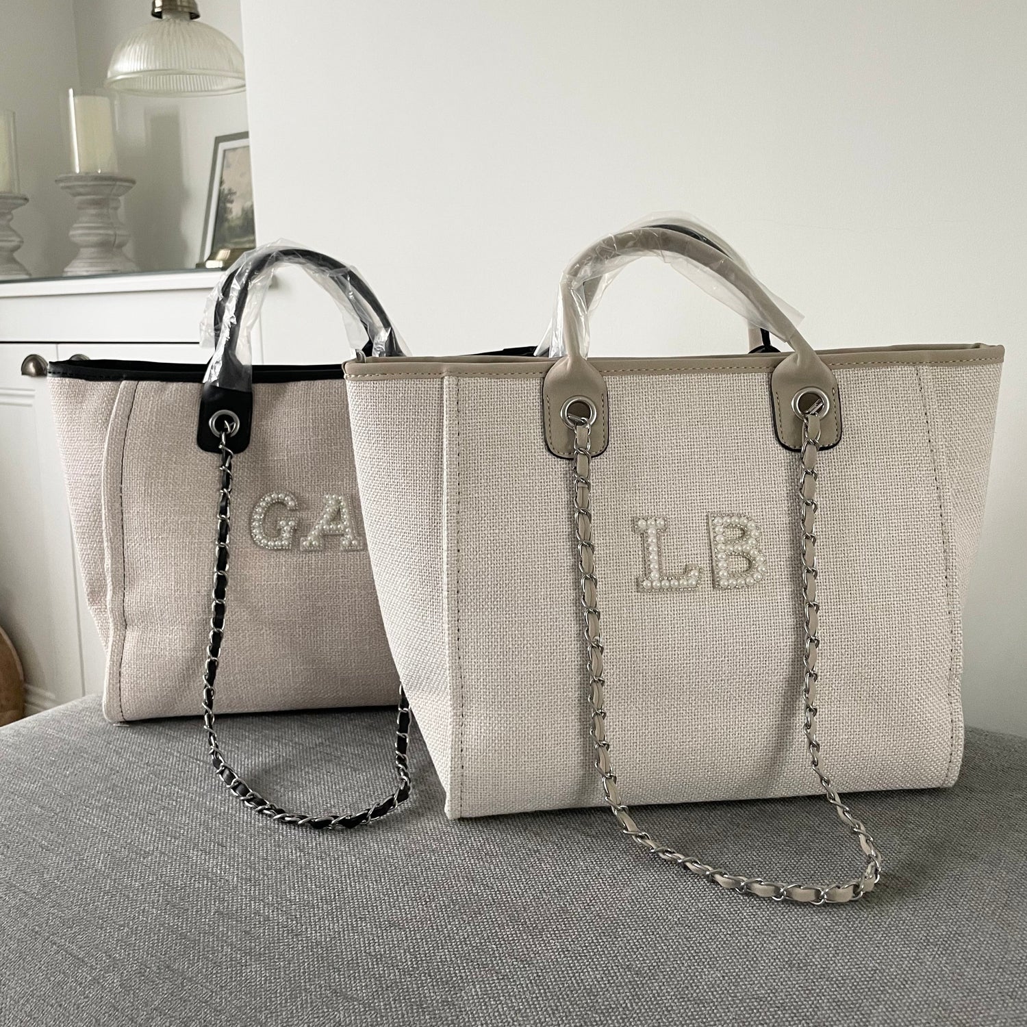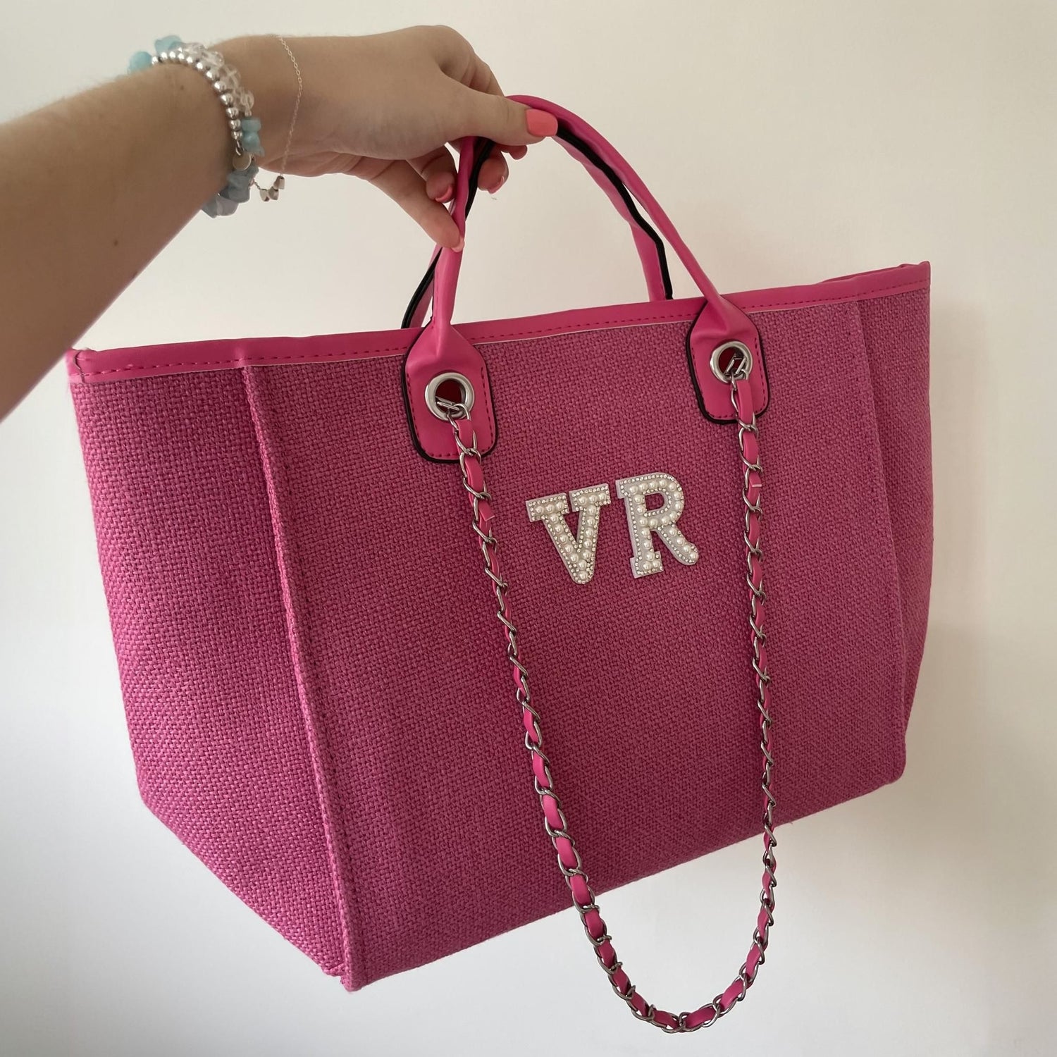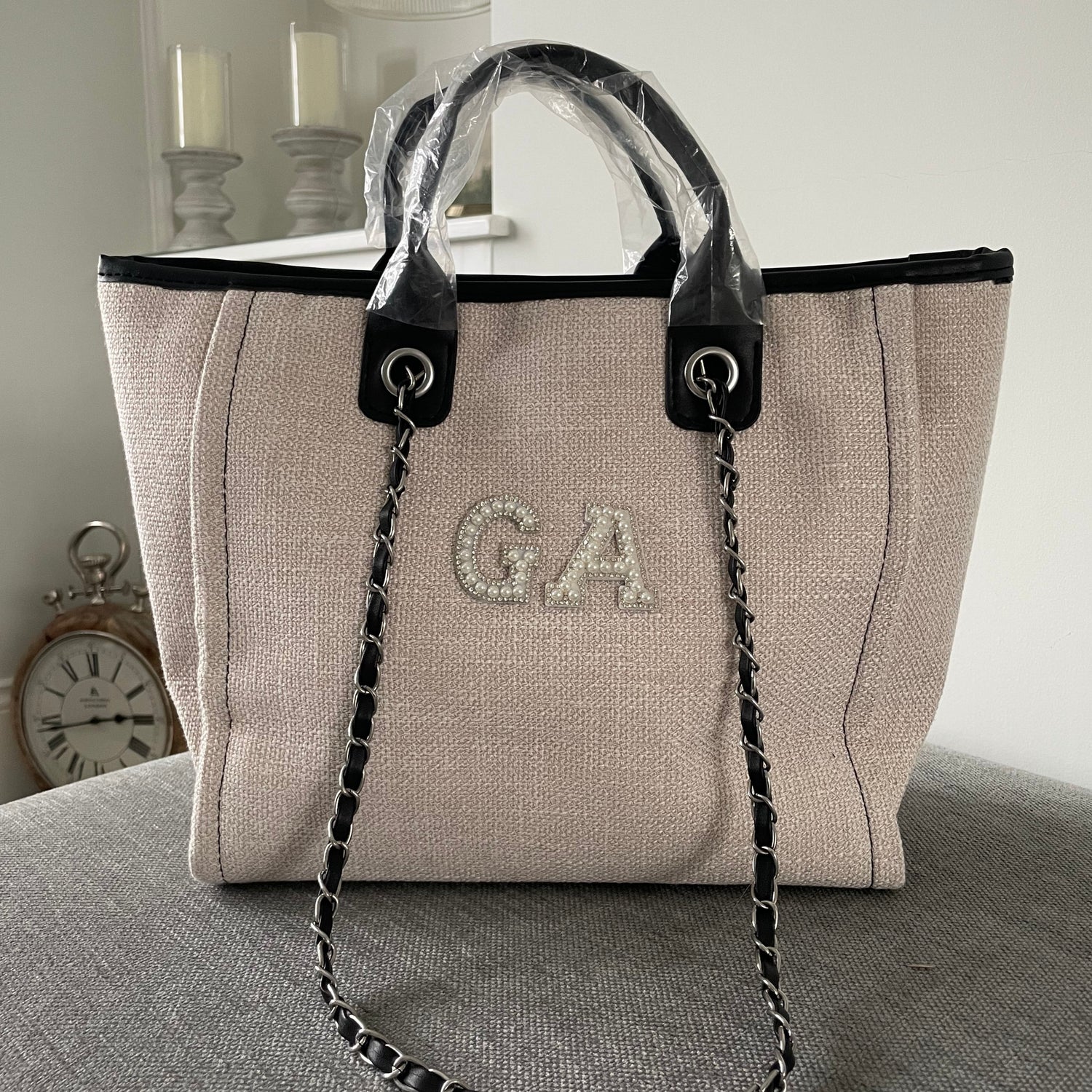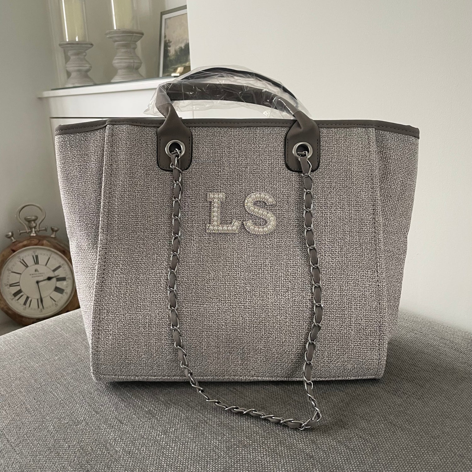 Personalised White Pearl Patch Chain Large Initial Tote Bags