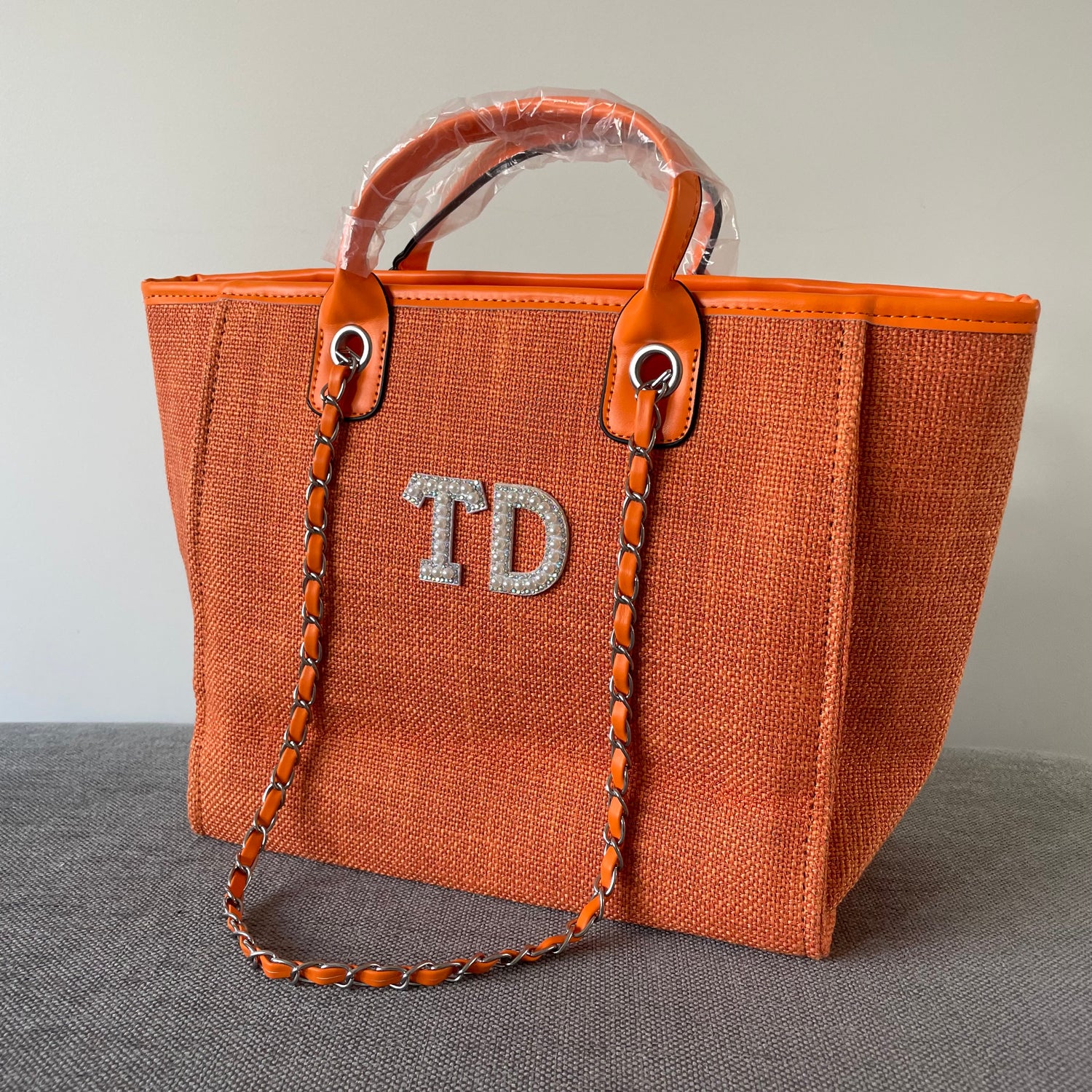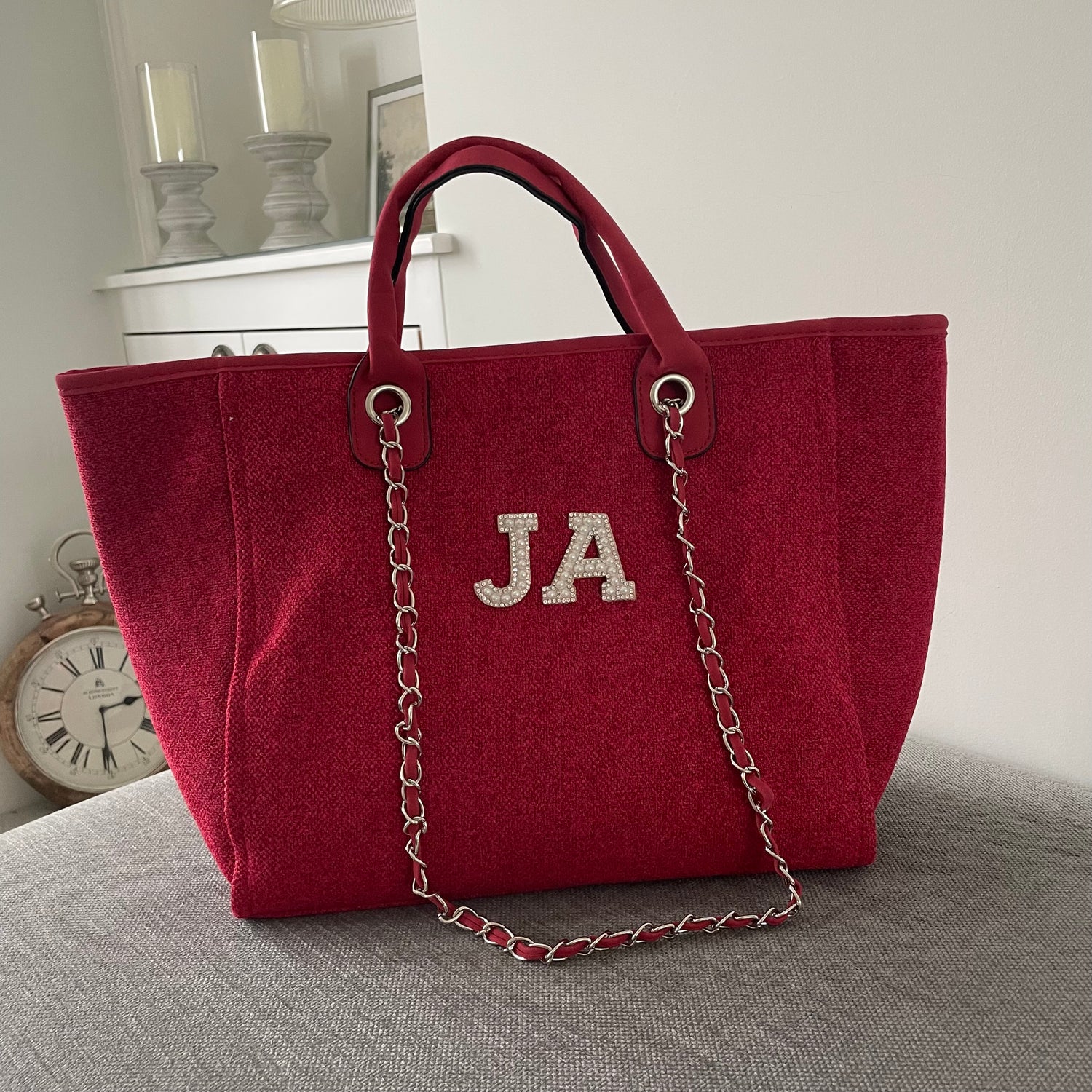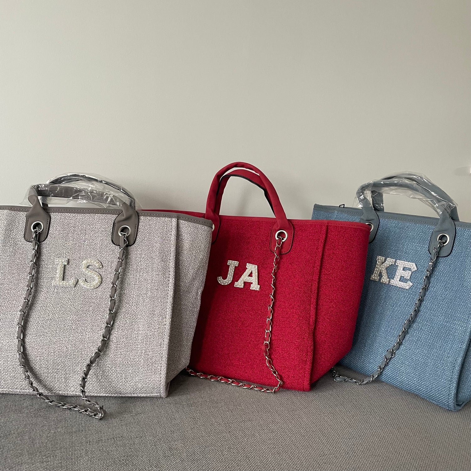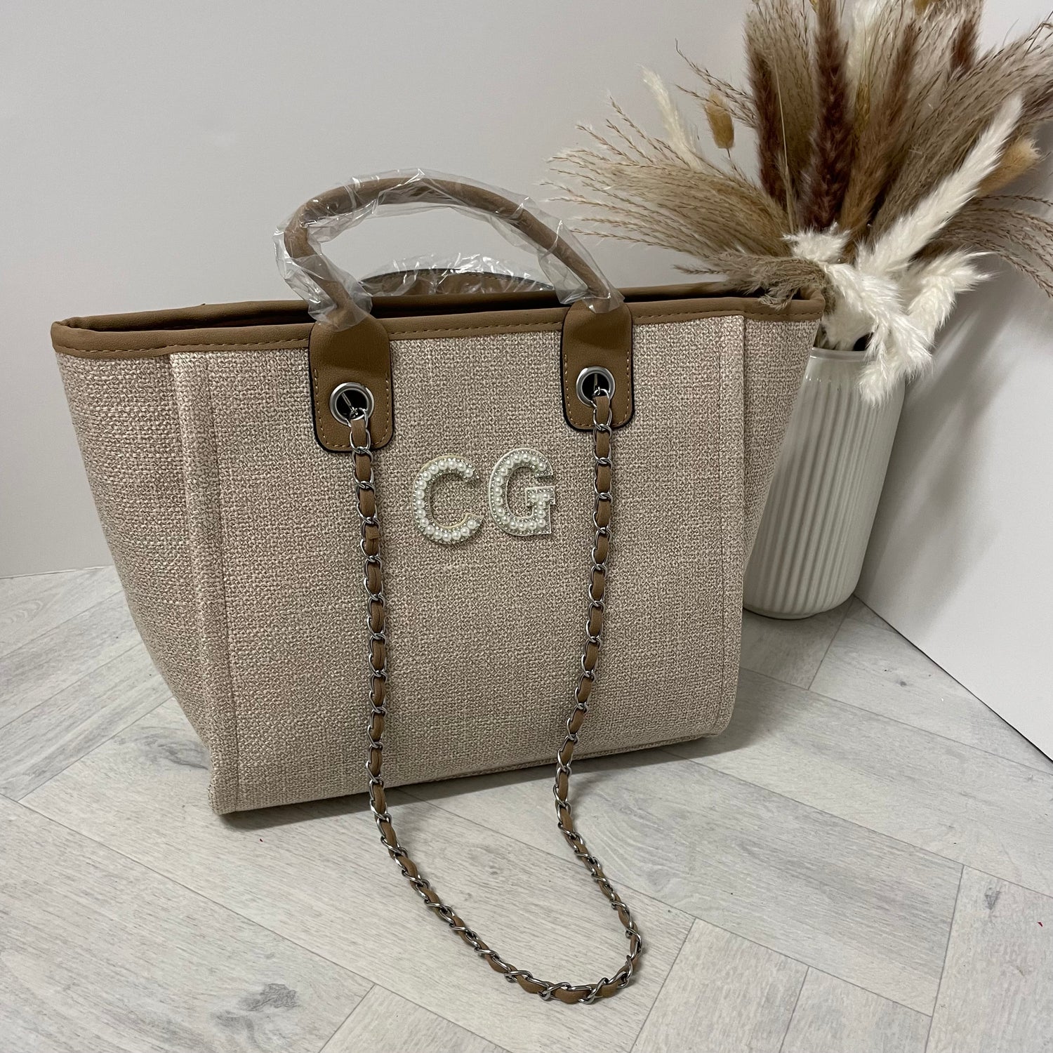 Personalised White Pearl Patch Chain Large Initial Tote Bags