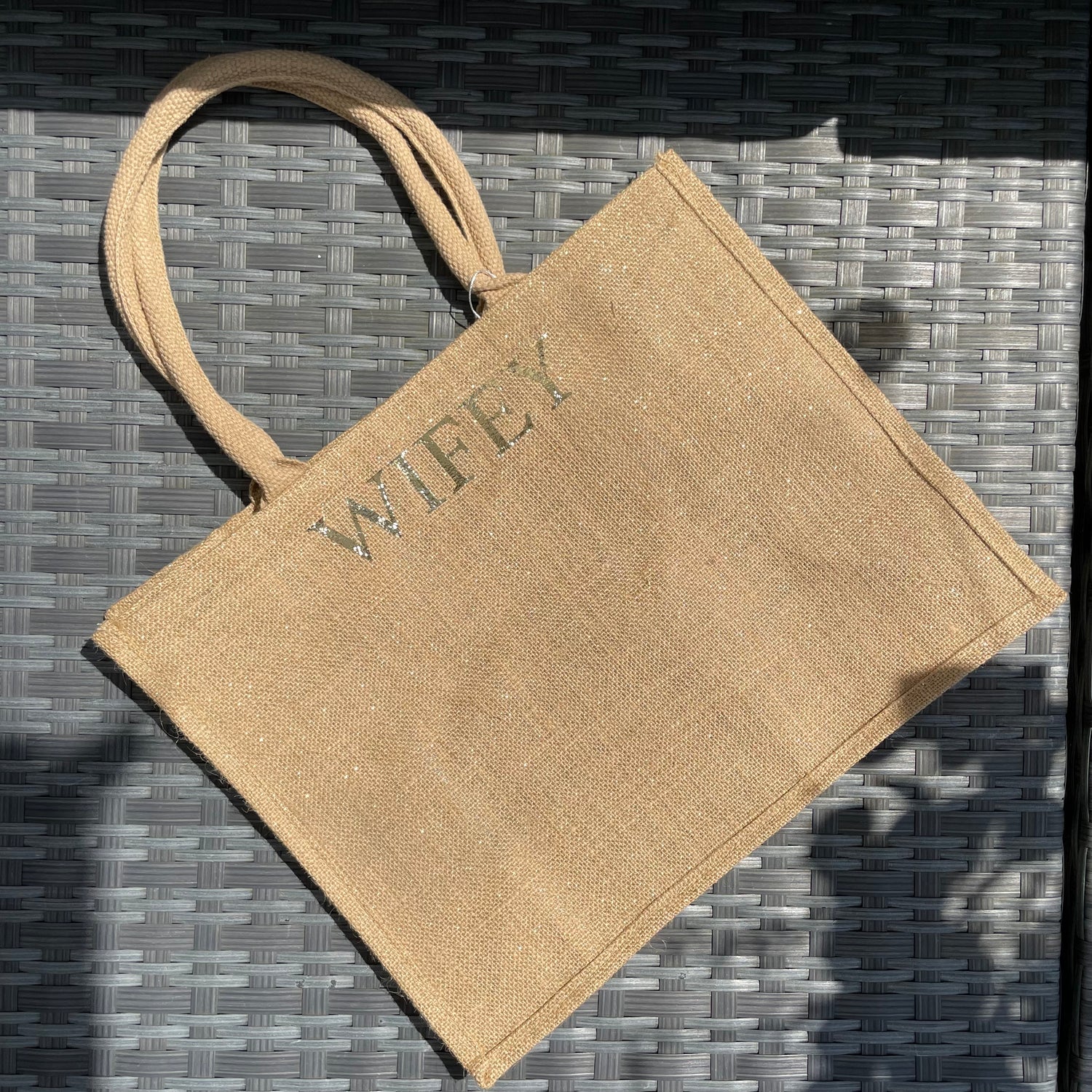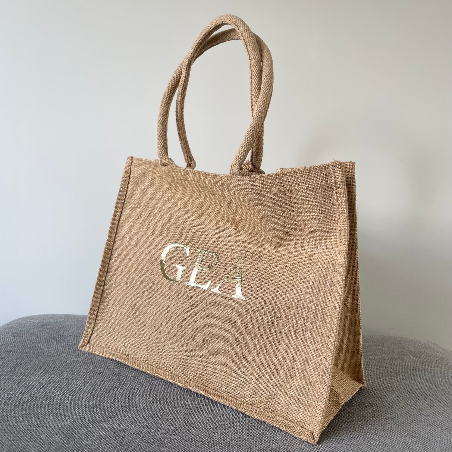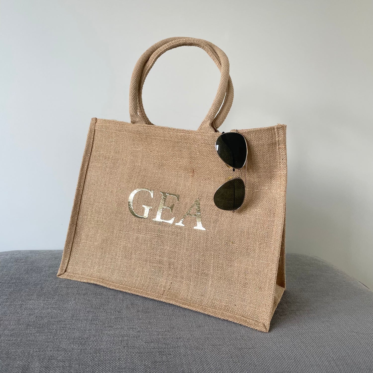 Personalised Square Gold Reflective Jute Shoulder Beach Shopper Tote Bag